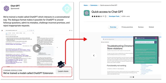 Ứng dụng (tiện ích) giả mạo có tên Quick access to Chat GPT, được cho là đã thu hút 2.000 lượt cài đặt mỗi ngày kể từ ngày 3 tháng 3 năm 2023. Hiện nó đã bị Google xoá khỏi Cửa hàng Chrome trực tuyến kể từ ngày 9 tháng 3 năm 2023.