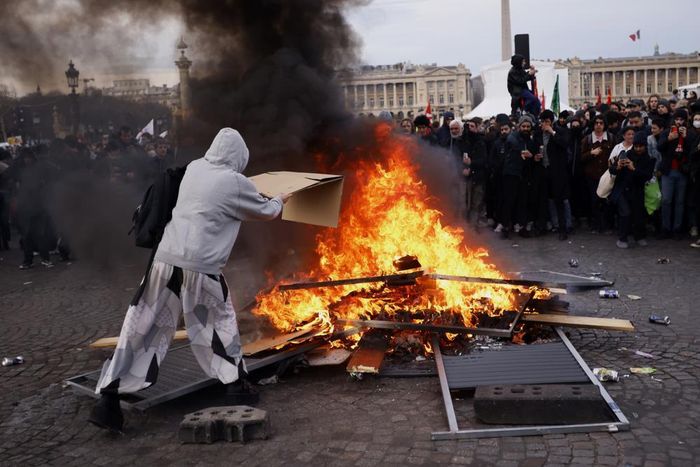 Người biểu tình đốt lửa trước trụ sở Quốc hội Pháp ngày 16/3. (Ảnh: AP)