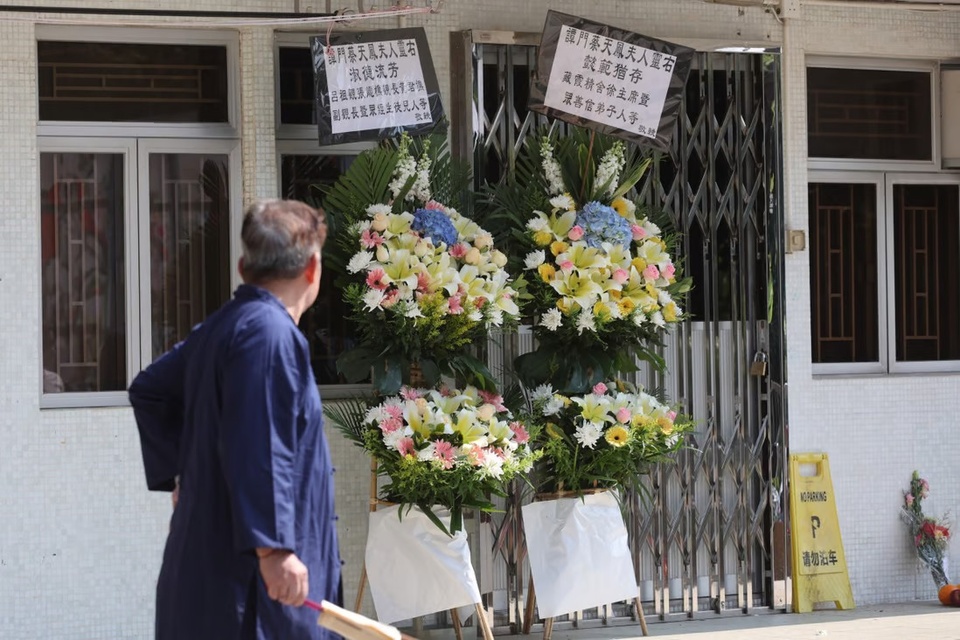 Những lẵng hoa tưởng niệm được đặt trước căn hộ nơi xảy ra vụ án của Abby Choi. Ảnh: Yik Yeung-man.