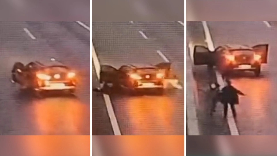 Trong video trích từ camera giám sát, chiếc xe hơi màu đen giảm tốc độ đột ngột, trong khi đèn khẩn cấp liên tục nhấp nháy. Ở vị trí tài xế và ghế ngồi phía trước, cửa xe đột ngột mở ra và hai người phụ nữ nhanh chóng nhảy ra khỏi lúc chiếc xe vẫn chưa dừng hẳn.