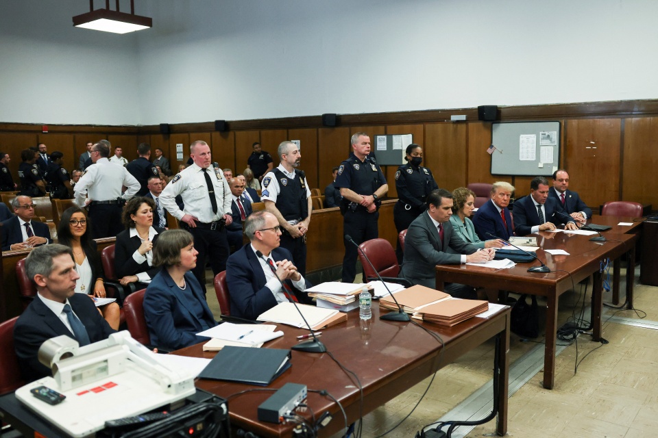 Đằng sau dãy bàn của công tố viên, người ngồi ngoài cùng bên phải là bà Susan Hoffinger, trưởng phòng điều tra của công tố viên quận Manhattan. Năm 2022, bà đã truy tố Trump Organization về tội gian lận thuế.