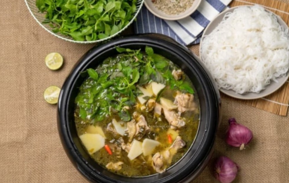 Nước lẩu gà lá giang thơm phức, khi nếm thử sẽ cảm nhận được vị chua chua cay cay của nước lẩu quyện với thịt gà dai vừa phải khiến chỉ muốn ăn mãi không thôi.