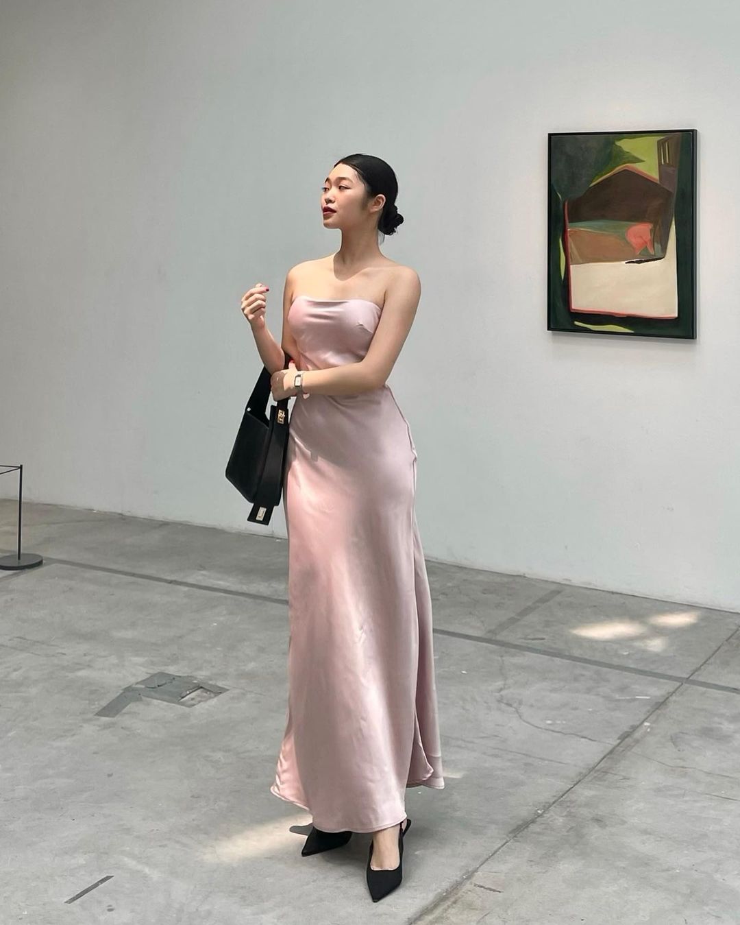 Đầm lụa dáng dài, cúp ngực, ôm sát cơ thể khéo léo làm nổi bật đường cong cơ thể một cách mềm mại. Cô phối cùng một chiếc giày cao gót quai mảnh, túi xách cùng màu, búi tóc gọn gàng. Tổng thể này giúp cô trông thanh thoát, mềm mại hơn.