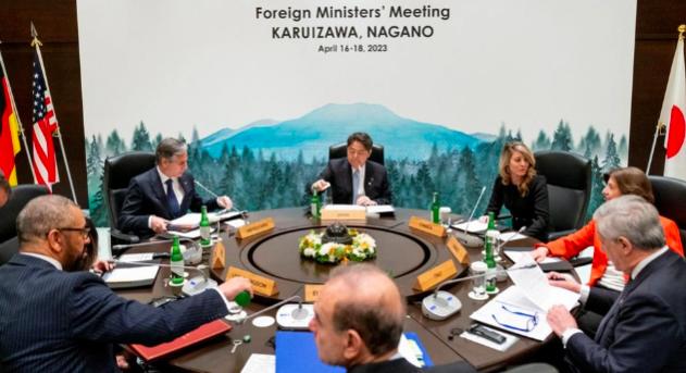 Liên quan đến xung đột Nga - Ukraine, Tuyên bố chung cho biết, các Ngoại trưởng đã thống nhất được nội dung quan trọng là tiếp tục viện trợ cho Ukraine và thực hiện một cách nghiêm khắc các biện pháp trừng phạt kinh tế đối với Nga, đồng thời phê phán mạnh mẽ việc Nga đặt vũ khí hạt nhân ở Belarus, yêu cầu các nước thứ 3 ngừng cung cấp vũ khí vào Nga, yêu cầu Trung Quốc ngừng hoạt động hỗ trợ Nga.