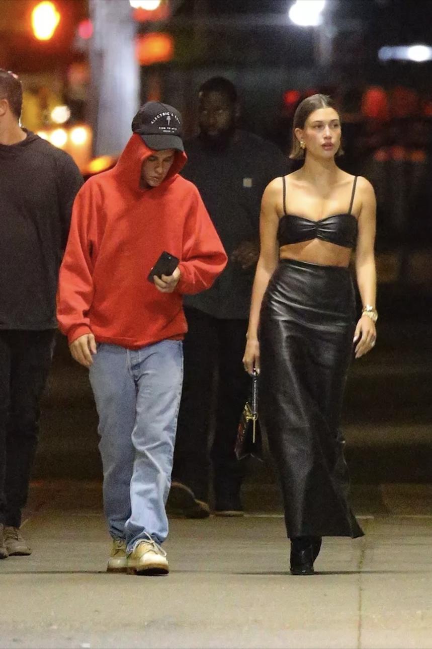 Hailey Bieber xuống phố cùng chồng với bra top và chân váy da. Ảnh: BACKGRID.