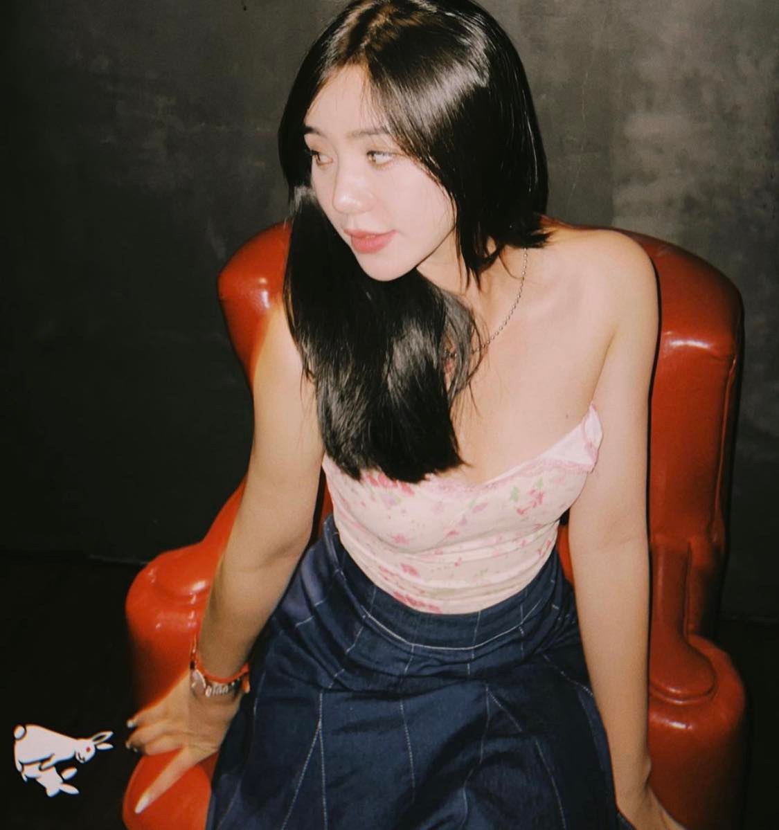 Quỳnh Kool khoe khéo vẻ đẹp tràn trề sức sống với outfit bao gồm áo 2 dây và chân váy denim - xu hướng của thập niên 2000.