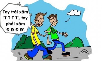 - Thì tao nói bên tay trái là 'Thương Trẻ Tàn Tật' bên tay phải thì 'Đang Đau Đừng Đánh' vậy là êm.