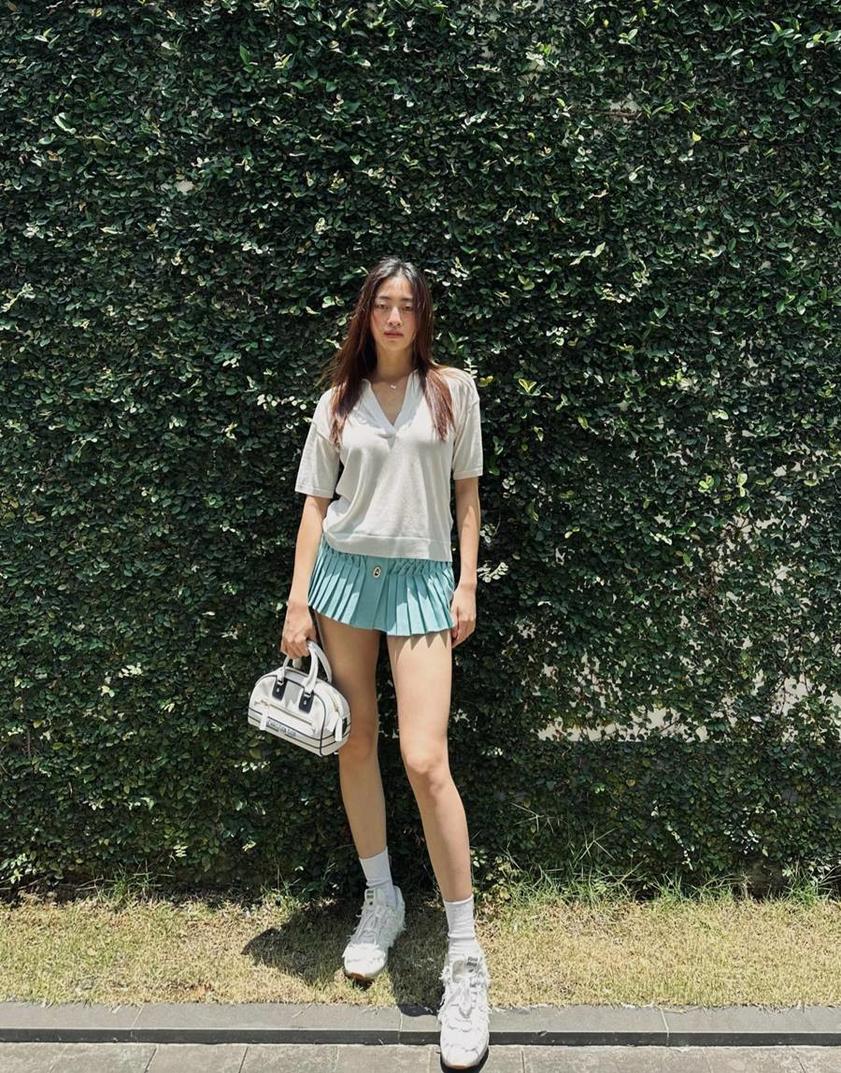 Dẫn đầu trong dàn người đẹp nhan sắc Việt, hoa hậu Lương Thùy Linh chọn mặc chân váy siêu ngắn khi thả dáng ngoại cảnh, cô phối chân váy xếp ly màu xanh với áo thun ngắn, giày thể thao và túi xách hàng hiệu.