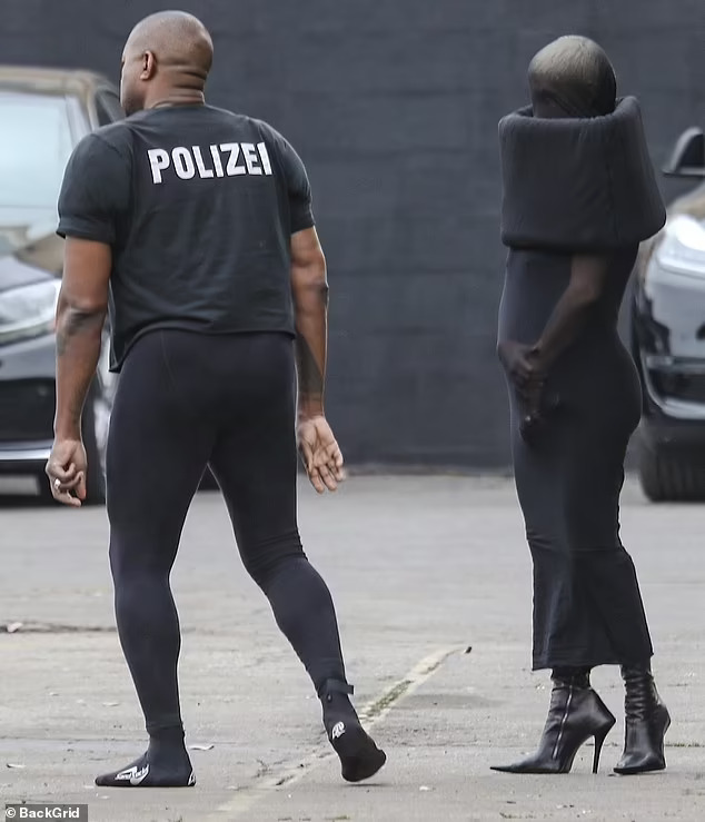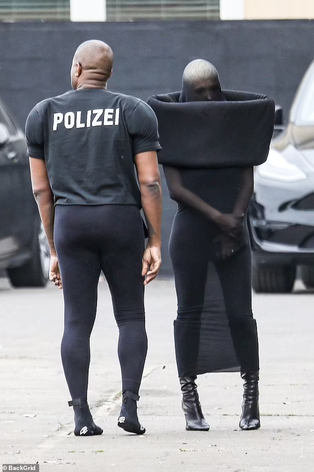 Rapper Kanye West mặc áo độn vai màu đen kết hợp với quần dài bó sát, giày đen. Bianca Censori diện trang phục cũng màu đen nhưng bó chặt đầu, hai tay của cô.