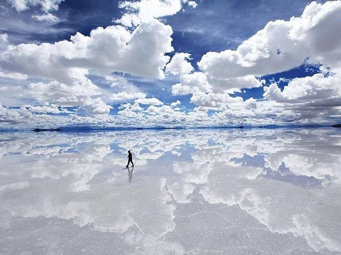 Vào mùa hè, Saler de Uyuni giống như một tấm gương khổng lồ phản chiếu bầu trời sau mỗi cơn mưa.
