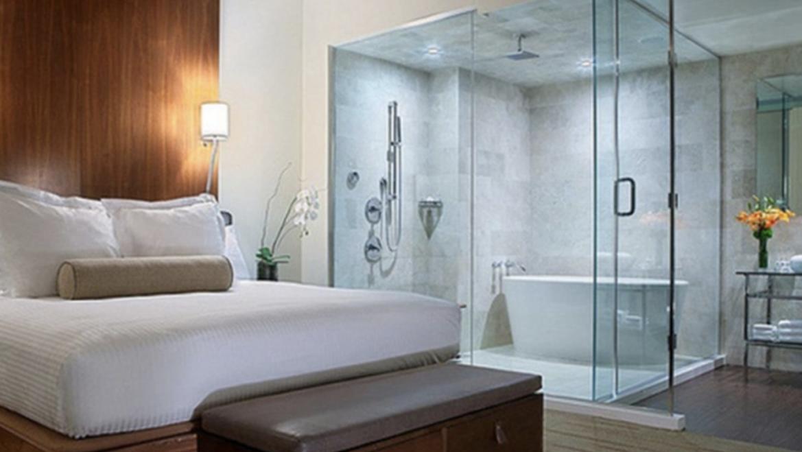 Hầu hết các khách sạn hiện nay đều sử dụng vách ngăn trong suốt cho phòng tắm.