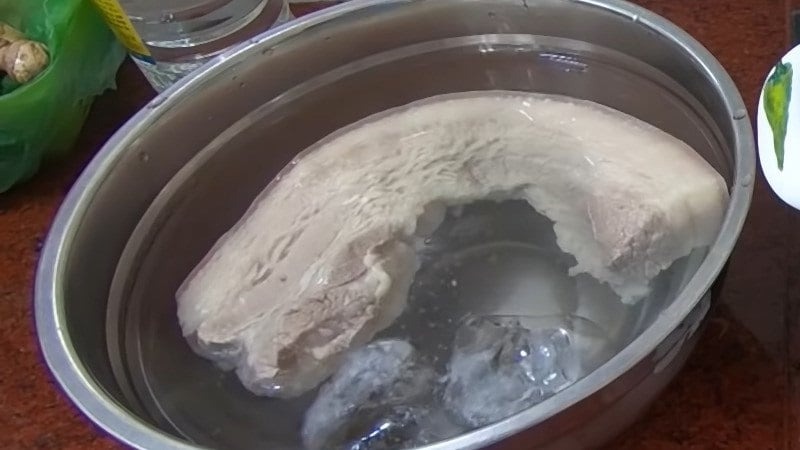 Thịt luộc xong đừng vội đem đi thái ngay. Bạn nên vớt thịt ra và ngâm vào một bát nước đun sôi để nguội có bỏ thêm đá lạnh. Khi gặp nước lạnh, miếng thịt sẽ co lại, phần da sẽ giòn hơn và thịt cũng không bị khô, thâm xỉn.