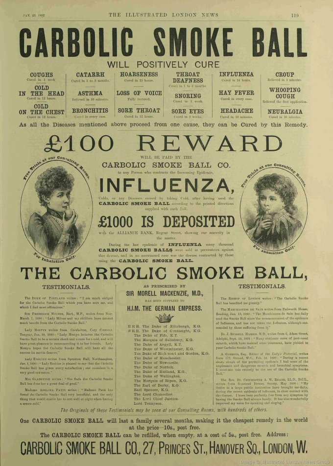 Vụ kiện tai tiếng về quảng cáo thuốc trong đại dịch cúm. Tại Anh, trong dịch cúm khiến một triệu người trên toàn cầu tử vong, năm 1890, hãng dược CSB hứa đền 100 bảng nếu dùng sản phẩm mà vẫn bị nhiễm. Nhưng khi khách đòi tiền, CSB nói "chỉ đùa thôi".