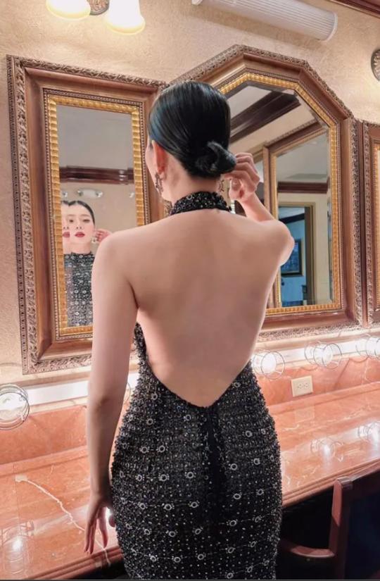Lệ Quyên mới đây "chiêu đãi" người hâm mộ với tạo hình mang hơi hướng cổ điển nhưng không kém phần quyến rũ. Lệ Quyên khéo léo chọn chiếc váy cổ yếm dài, đính kim sa lấp lánh kết hợp cùng kiểu tóc búi cao. Đặc biệt, thiết kế này còn giúp nữ ca sĩ khoe trọn lưng trần nuột nà, trắng hồng, không chút khuyết điểm.