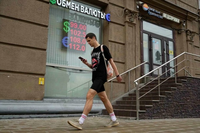 Một người đàn ông đi ngang qua một điểm đổi tiền ở Moskva ngày 14/8. Ảnh: AP