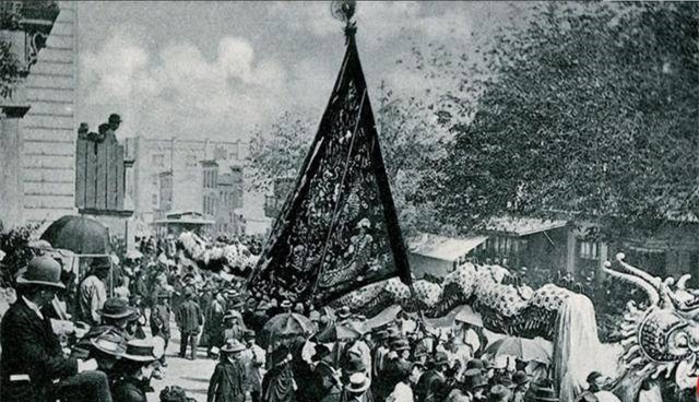 Trong bức ảnh dưới đây, chúng ta có thể thấy những người Trung Quốc bày bàn cúng với nhiều lễ vật khác nhau trên đó. Xung quanh xuất hiện rất nhiều người Mỹ đứng xem vì có lẽ đối với họ, đây là những khung cảnh mà chưa bao giờ được chứng kiến.