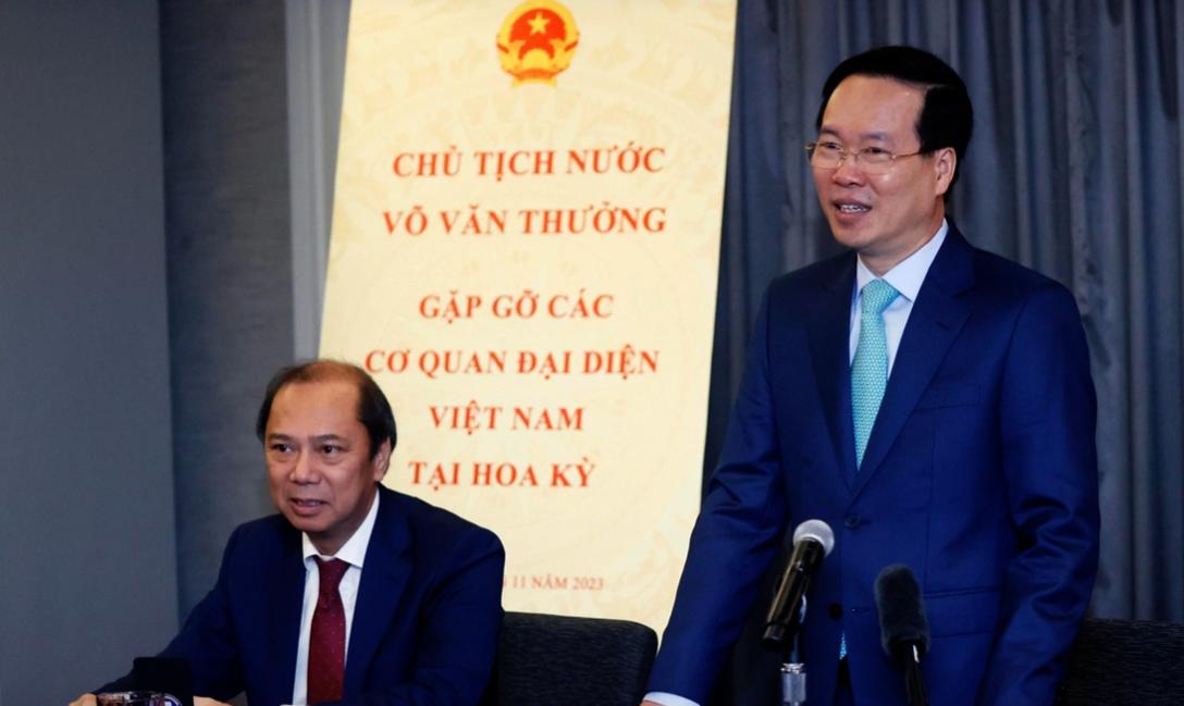 Báo Tuổi trẻ ngày 15 tháng 11 năm 2023 loan tin, vào chiều 14 tháng 11 giờ địa phương, ông Võ Văn Thưởng, Chủ tịch nước Cộng sản đã có cuộc gặp gỡ với các viên chức, nhân viên các cơ quan đại diện Cộng sản Việt Nam tại Hoa Kỳ. Tại đây, ông Thưởng yêu cầu các cơ quan đại diện Việt Nam tại San Francisco và Houston tăng cường xúc tiến hợp tác giữa các địa phương của Việt Nam với các địa phương của Hoa Kỳ, thúc đẩy người gốc Việt ở Hoa Kỳ gửi tiền đầu tư về nước. Đồng thời, phải tuyên truyền để người gốc Việt ở Hoa Kỳ hiểu đúng, hiểu đầy đủ, và chính xác về tình hình thực tiễn tại Việt Nam hiện nay, cũng như giải đáp các băn khoăn, vướng mắc của họ. Theo ông Thưởng, việc kết nối giữa các công ty và các địa phương hai nước có ý nghĩa quan trọng, góp phần thực hiện hoá các cam kết, thoả thuận cấp cao giữa hai bên. Và việc Việt Nam và Hoa Kỳ nâng cấp quan hệ sẽ mang lại cơ hội hợp tác rất lớn giữa hai nước cả về kinh tế, thương mại, đầu tư, giáo dục, khoa học, sản xuất, tham gia vào chuỗi cung ứng hàng hoá chất lượng cao. Nhưng, để các cam kết này được thực hiện là cả một quá trình, nên ông Thưởng yêu cầu Đại sứ quán, và các cơ quan đại diện của nhà cầm quyền ở Hoa Kỳ nỗ lực thúc đẩy để biến các cam kết trên giấy thành hành động thực tiễn.