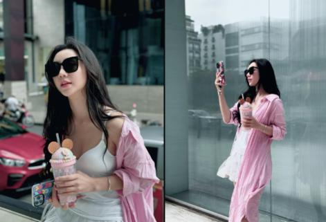 Trong hình, cô khoe dáng với áo thun hai dây phối cùng chân váy siêu ngắn, để lộ đôi chân kém thon gọn, vốn từng được xem là khuyết điểm hình thể. Nữ diễn viên 28 tuổi khéo léo mix thêm một chiếc áo sơ mi màu hồng dài qua đầu gối. Sự kết hợp này giúp cô vừa giữ ấm trong cái lạnh đầu mùa, vừa che đi khuyết điểm bắp tay và bắp chân to. Người đẹp phối cùng một đôi dép cao màu trắng, các phụ kiện đi kèm như kính mắt, túi xách, cốc nước,... trông cực kỳ bắt mắt.
