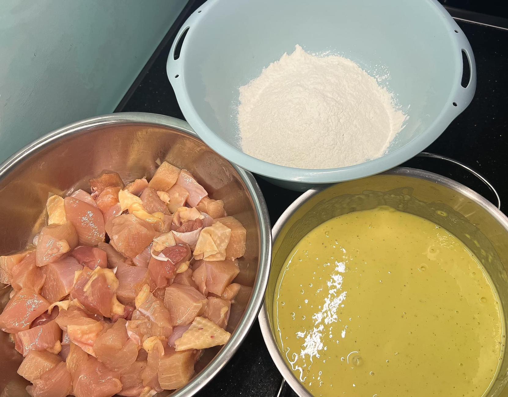 Cách làm gà viên chiên: Gà thái miếng vừa ăn bột ướt và bột khô