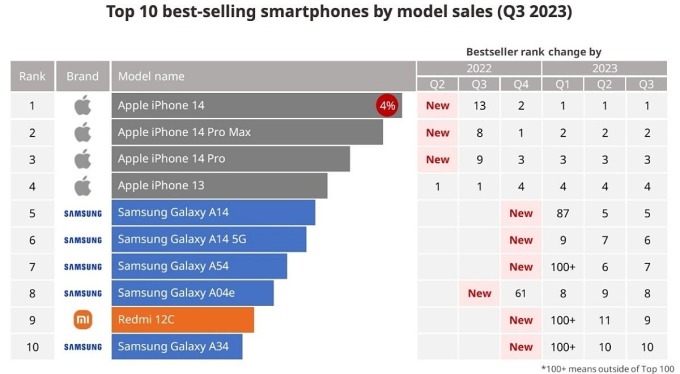 Theo thống kê của công ty phân tích thị trường Canalys, iPhone 14 vẫn là điện thoại được ưa chuộng nhất thế giới, tương tự quư trước đó, tiếp theo là 14 Pro Max, 14 Pro và iPhone 13. Samsung chiếm năm vị trí, đều là model thuộc ḍng Galaxy A, gồm A14, A14 5G, A54, A04e và A34. Xiaomi có một model là Redmi 12C xếp ở vị trí thứ 9.