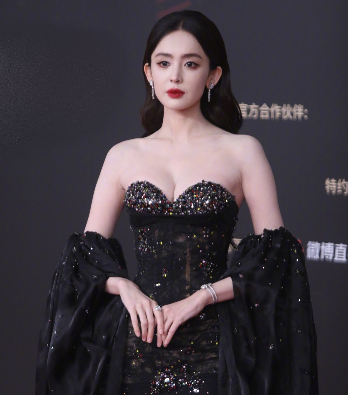 Tông màu đen chủ đạo kết hợp các chi tiết xuyên thấu, đính hạt lấp lánh, cùng phần áo choàng điểm nhấn khiến Cổ Lực Na Trát trông kiêu kỳ, sang trọng và lộng lẫy. Người đẹp lựa chọn tông son đỏ cùng kiểu tóc xoã vén gọn, tôn lên đường nét khuôn mặt góc cạnh.
