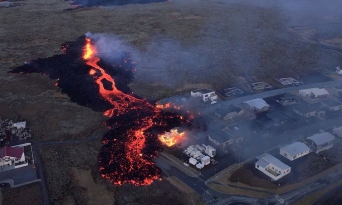 Những dòng dung nham phun trào từ hệ thống núi lửa Sundhnúkur ở tây nam Iceland hôm 14/1/2024. Dung nham chặn kín nhiều con đường và sủi lên từ một khe nứt mới tràn vào vùng ngoại ô thị trấn ven biển Grindavík, thiêu rụi ít nhất 3 ngôi nhà trên đường đi. Gần đó, các phương tiện xây dựng trước đó làm việc suốt hàng tuần để xây dựng đập đất và bờ ngăn trong nỗ lực chuyển hướng dòng dung nham, buộc phải rút lui, theo Popular Science.
