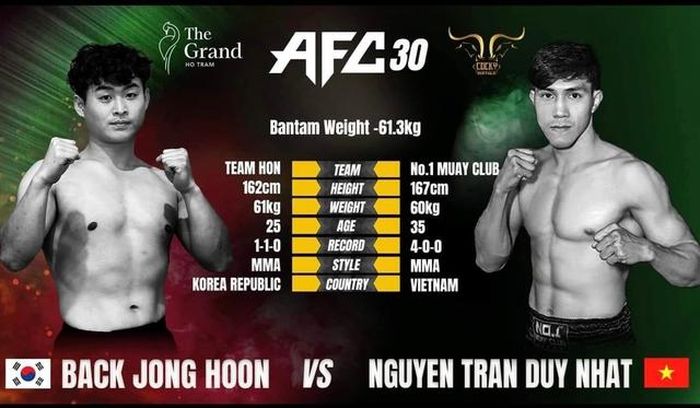 Trên trang cá nhân mới đây, Nguyễn Trần Duy Nhất xác nhận sẽ chạm trán đối thủ người Hàn Quốc Back Jong Hoon tại sự kiện AFC 30 được tổ chức ở Việt Nam. Theo thông tin ban đầu, màn so tài này sẽ diễn ra theo thể thức MMA, ở hạng bantam (61,3kg).
