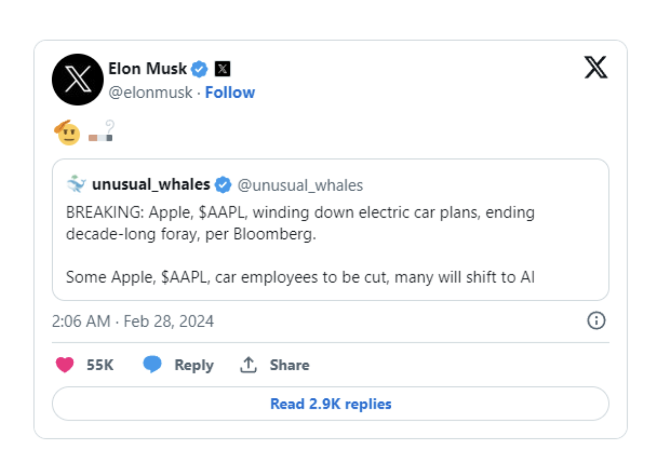 Thông tin Apple từ bỏ dự an đầy tham vọng, mục tiêu thay thế iPhone để trở thành ông vua xe điện với hàng chục năm đầu tư cùng hàng tỷ USD, đã khiến Elon Musk phải ăn mừng.