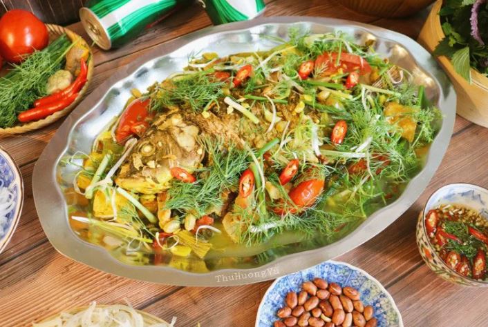 - Sau khi nước dùng sôi trở lại, cho cá đã chiên vào và om liu riu trên lửa nhỏ trong 15 phút, thêm giấm bỗng vào để tăng thêm hương vị cho món ăn.