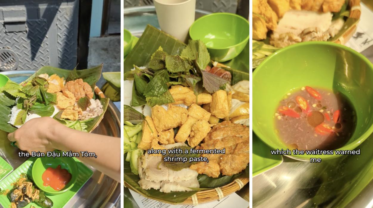 Đặc biệt, thứ hấp dẫn nhất chính là món bún đậu mắm tôm - điều khiến rất nhiều thực khách muốn ghé tới đây. Đồ ăn được đựng trong mẹt lót lá chuối - kiểu ăn uống quen thuộc của món bún đậu mắm tôm tại Việt Nam. Và đặc biệt, theo chia sẻ của chủ quán, để mọi thứ có được hương vị chuẩn Việt Nam nhất thì quán đều tự làm từ dồi tới đậu hay chuẩn bị những nguyên liệu khác... Mắm tôm cũng được pha chế đúng kiểu ăn bún đậu mắm tôm truyền thống.