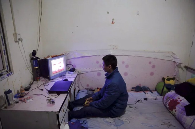 Một thanh niên đang chơi điện tử trong căn phòng trọ 200 tệ mỗi tháng. Ảnh: Udn