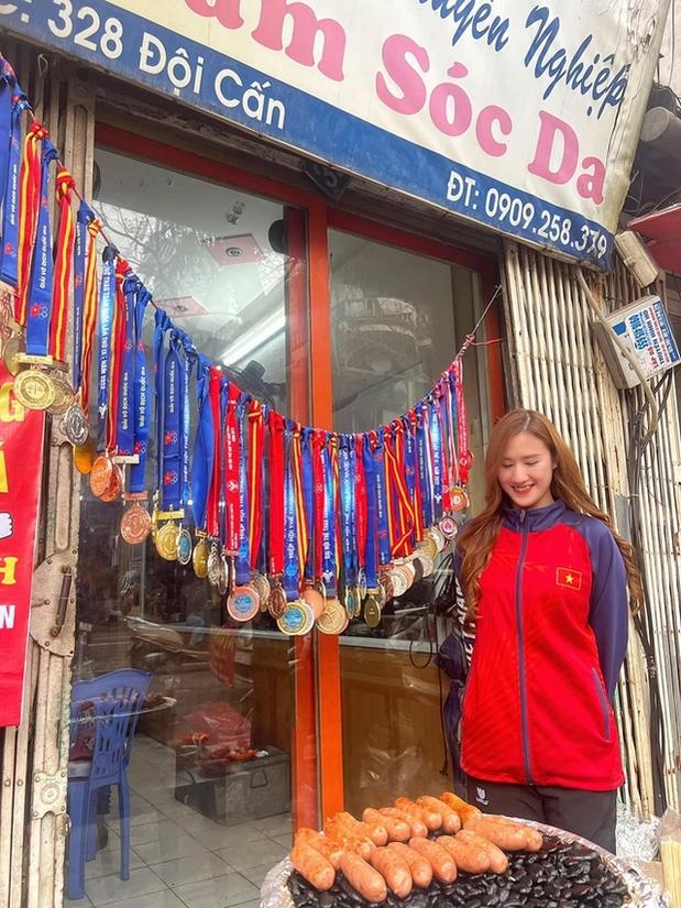 "Mình mới kinh doanh 1 tháng. Hiện giờ trend lạp xưởng cũng đã bão hòa, nên quán cũng bán túc tắc. Mình "flex" huy chương để tạo điểm nhấn cho quán. Lúc vắng khách, ngồi ngắm huy chương cũng thấy rất mãn nguyện", Phương Anh nói.