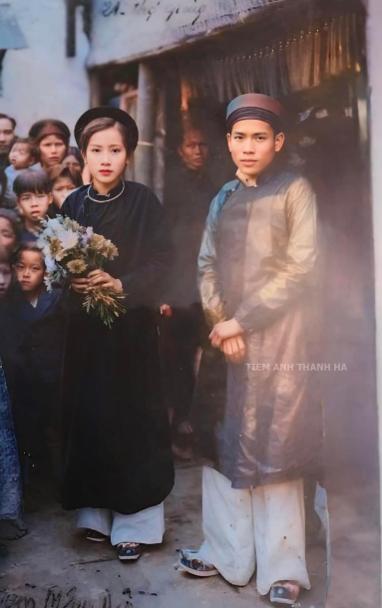 Trong ảnh, cô dâu chú rể mang áo dài khăn đóng, trang phục chỉnh tề, tay cầm hoa tươi đẹp mắt.