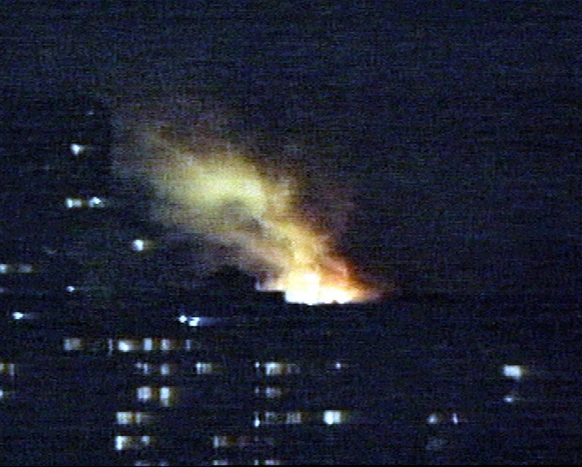 Lửa bùng phát từ một tòa nhà bị trúng bom ở Belgrade. Hình ảnh được phát trên truyền hình Nam Tư đêm 24/3/1999