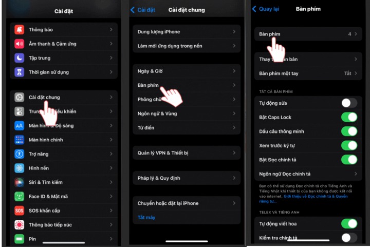 Bước 1: Truy cập vào "Cài đặt" chọn "Cài đặt chung" chọn "Bàn phím" chọn tiếp "Bàn phím".