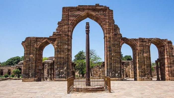 Bước chân vào sân trong của Nhà thờ Hồi giáo Quwwat-ul-Islam thuộc quần thể Qutb Minar, du khách sẽ không khỏi choáng ngợp trước cột trụ sắt khổng lồ cao 7,2 mét, nặng 6 tấn với đỉnh được chạm khắc tinh tế. Điều đáng kinh ngạc hơn cả là cột trụ này còn có niên đại lâu đời hơn cả khu phức hợp.