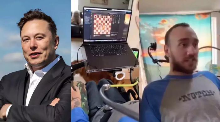 Tỷ phú Elon Musk (trái) và bệnh nhân bị liệt từ vai trở xuống chơi cờ và di chuyển trỏ chuột bằng suy nghĩ sau khi được cấy ghép chip Neuralink vào não. Ảnh: Times Now News
