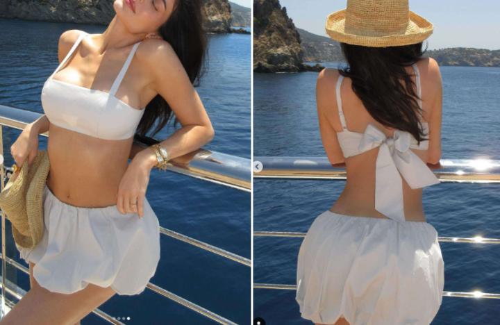 Mới đây, cô nàng tiếp tục chia sẻ lên trang cá nhân khoảng khắc đi biển của mình, chọn thiết kế gồm áo croptop cùng chân váy bềnh bồng nhẹ nhàng, "nữ tỷ phú" ngay lập tức nhận được nhiều lời khen của công chúng. Outfit được cho là cực kỳ phù hợp, với chi tiết nơ thắt sau lưng làm điểm nhấn, hài hòa và ấn tượng.