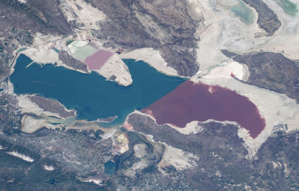 Hồ muối lớn (Great Salt Lake) nằm ở bang Utah, Mỹ, là một địa điểm thiên nhiên kỳ thú với cảnh quan độc đáo: hồ nước bị chia thành hai phần, một bên có màu xanh lam và một bên có màu đỏ hồng rực rỡ.