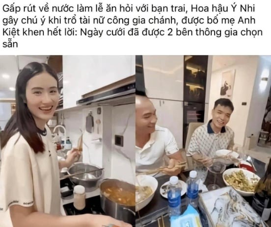 Vừa qua dân tình xôn xao bài đăng có hình ảnh Hoa hậu Ý Nhi và bạn trai với nội dung: "Gấp rút về nước làm lễ ăn hỏi với bạn trai, Hoa hậu Ý Nhi gây chú ý khi trổ tài nữ công gia chánh, được bố mẹ Anh Kiệt khen hết lời" xuất hiện trên mạng xã hội. Bài đăng còn cho biết cặp đôi đã ấn định ngày tổ chức lễ cưới.