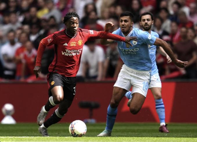 Kobbie Mainoo (áo đỏ) chạm trán Rodri (áo xanh) ở trận Man Utd thắng Man City 2-1 tại chung kết FA Cup 2022-2023. Ảnh: PA