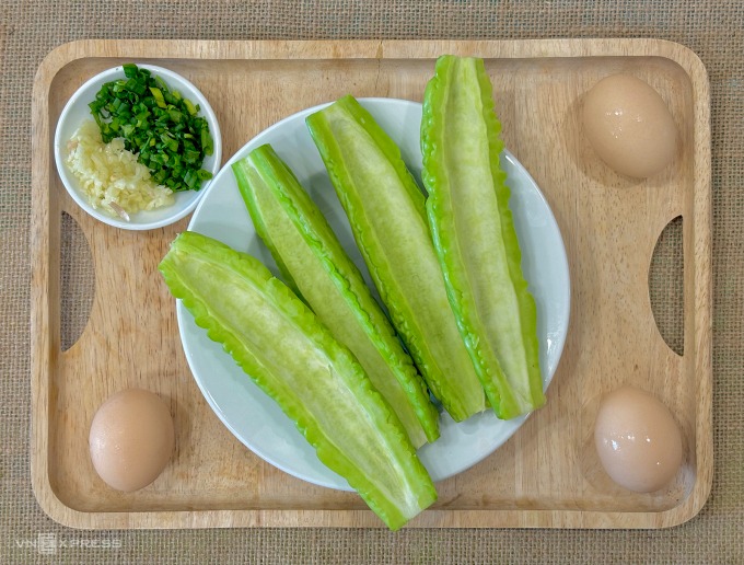 Mướp đắng và hành lá mua về rửa sạch. Nên chọn quả vừa, cầm chắc tay, đầu tròn không nhọn, màu xanh nhạt, đường vân rộng thì ăn thịt quả sẽ dày, ít đắng hơn.
