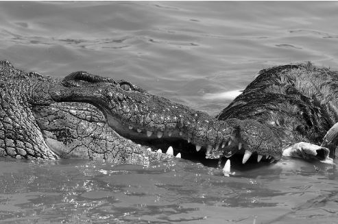 Sau khi lấy đà, có thể thấy con cá sấu đã chồm lên khỏi mặt nước, nhấc bổng xác con linh dương lên không trung, rồi lắc mạnh cổ.