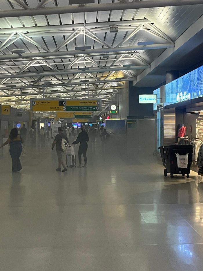 Khói dày đặc bao phủ Nhà ga 8 của sân bay JFK vào khoảng 7h sáng sau khi hỏa hoạn bùng phát tại thang cuốn ở sảnh C.