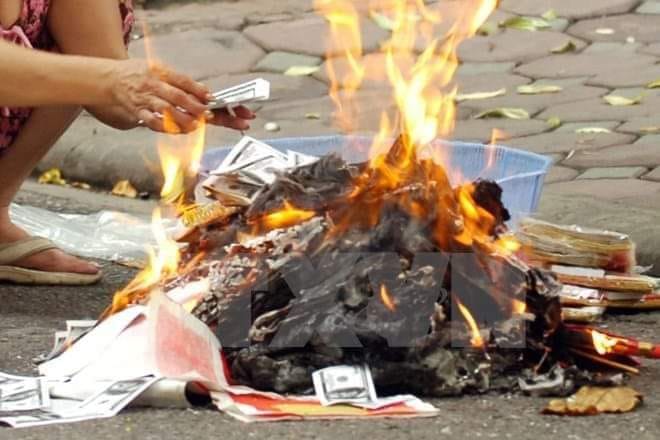- Ô hay, cái hôm 49 ngày em có đốt cho anh cả mấy chục xấp tiền đó, anh xài hết rồi sao ?