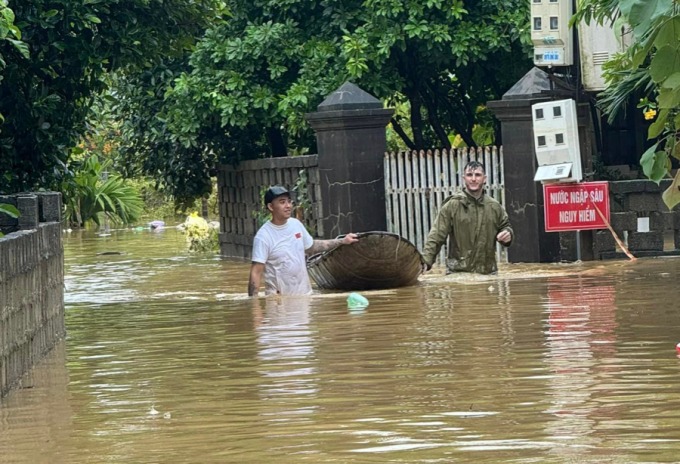 Nước dâng ngang bụng, Nathan đội áo mưa, mượn chiếc thuyền chất 200 suất đồ ăn cùng các tình nguyện viên lội vào phát cho các hộ dân ở xã Hóa Thượng, huyện Đồng Hỷ.