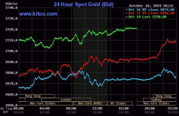 Trong phiên giao dịch 18/10, vàng có thời điểm chạm 2.722 USD một ounce. Kim loại quý chốt phiên ở 2.720 USD, tăng 28 USD so với hôm qua. Đây là phiên thứ hai liên tiếp thị trường lập đỉnh mới.