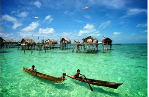 Những ngôi nhà gỗ hoặc lều, được dựng trên rạn san hô gần các đảo ở Indonesia, Malaysia hay Philippines.