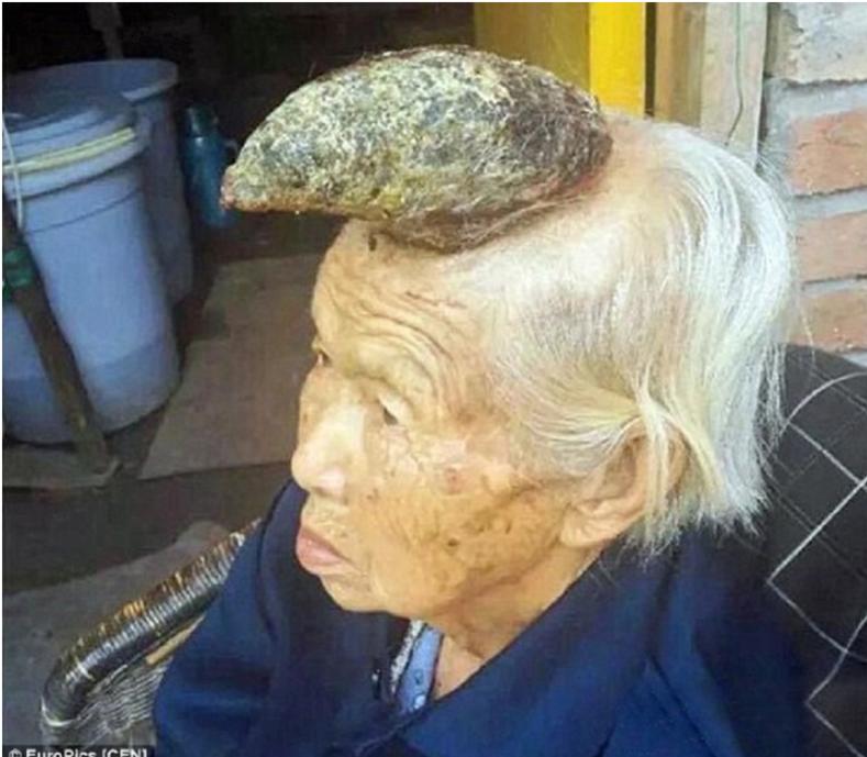 Cụ bà Chen (sống tại Phổ Ninh, tỉnh Quảng Đông, Trung Quốc) trở thành người nổi tiếng ở địa phương vì chiếc sừng kỳ lạ mọc trên trán. Chiếc sừng 10cm này đã xuất hiện cách đây vài năm, được người dân trong vùng gọi là “sừng trường thọ”.