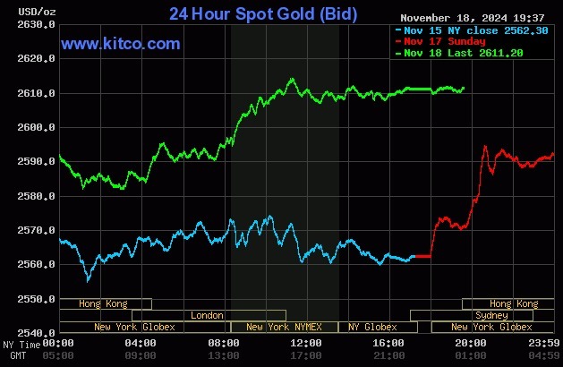Chốt phiên giao dịch 18/11, giá vàng thế giới giao ngay tăng 48 USD lên 2.611 USD một ounce. Thị trường nhờ đó chấm dứt chuỗi 6 phiên giảm trong tuần trước khiến vàng xuống đáy 2 tháng.